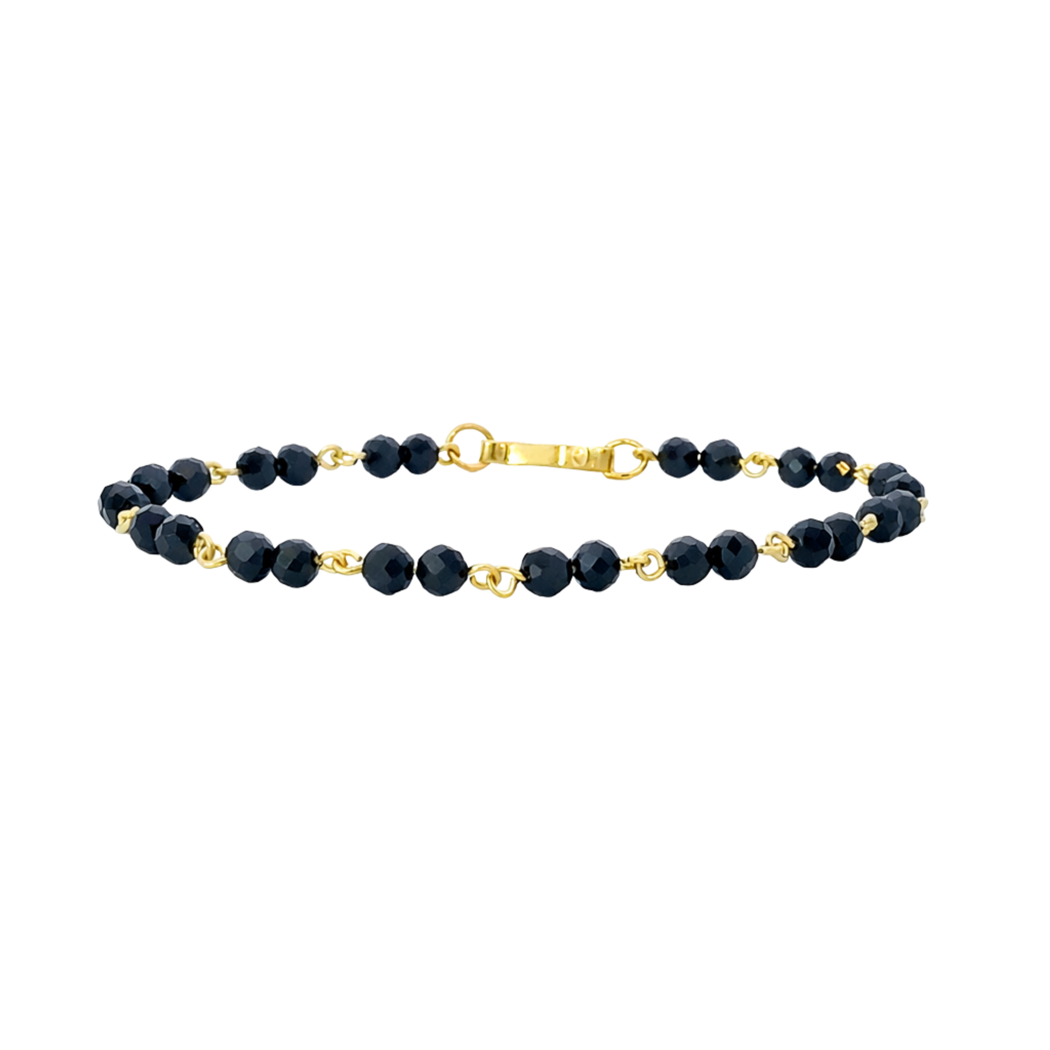 Hand-assembled with precision, this hand band features smaller, uniformly cut round jet beads, each carefully faceted to enhance natural shine and clarity. The beads are individually linked with finely crafted gold connectors, allowing for smooth movement and lasting durability.