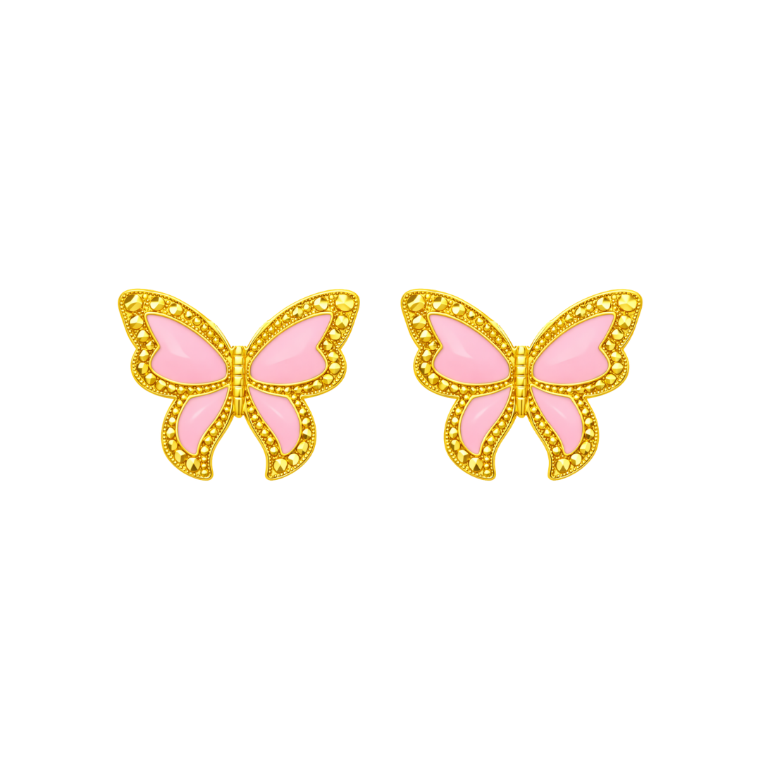 Each wing is smoothly filled with vibrant enamel, creating a gentle contrast against the surrounding gold. The polished diamond-cut beaded borders frame the butterfly’s shape with refined detail, enhancing light reflection while maintaining a clean, balanced profile.