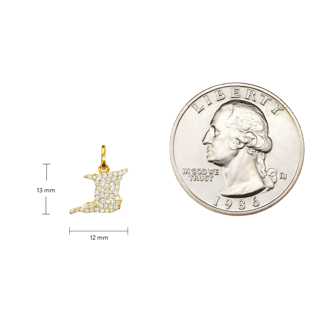 This pendant captures the unmistakable outline of Trinidad, refined into a bold yet balanced silhouette. Fully adorned with diamonds, the island form maintains its recognizable contours while delivering striking brilliance. Polished gold edges frame the design, enhancing contrast and allowing the diamonds to shine while preserving the integrity of the map shape.
