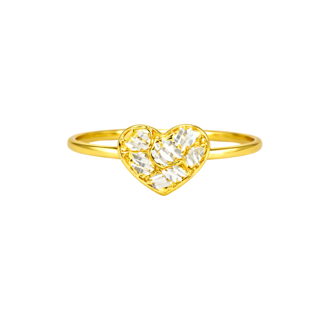 Each reflective facet within the heart is precision-finished to maximize sparkle and clarity, while the surrounding polished gold frame enhances definition and structure. The slim rounded band is refined for durability and comfort, ensuring this piece remains suitable for everyday wear without compromising on luxury or craftsmanship.