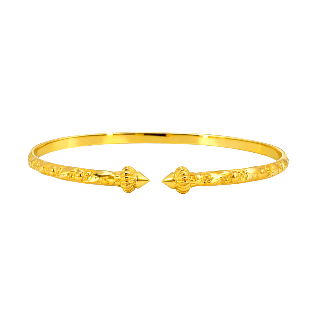 - Structure: Open bangle with decorative end caps.
