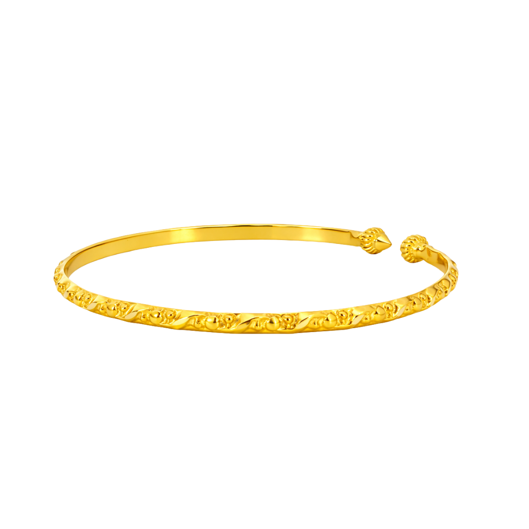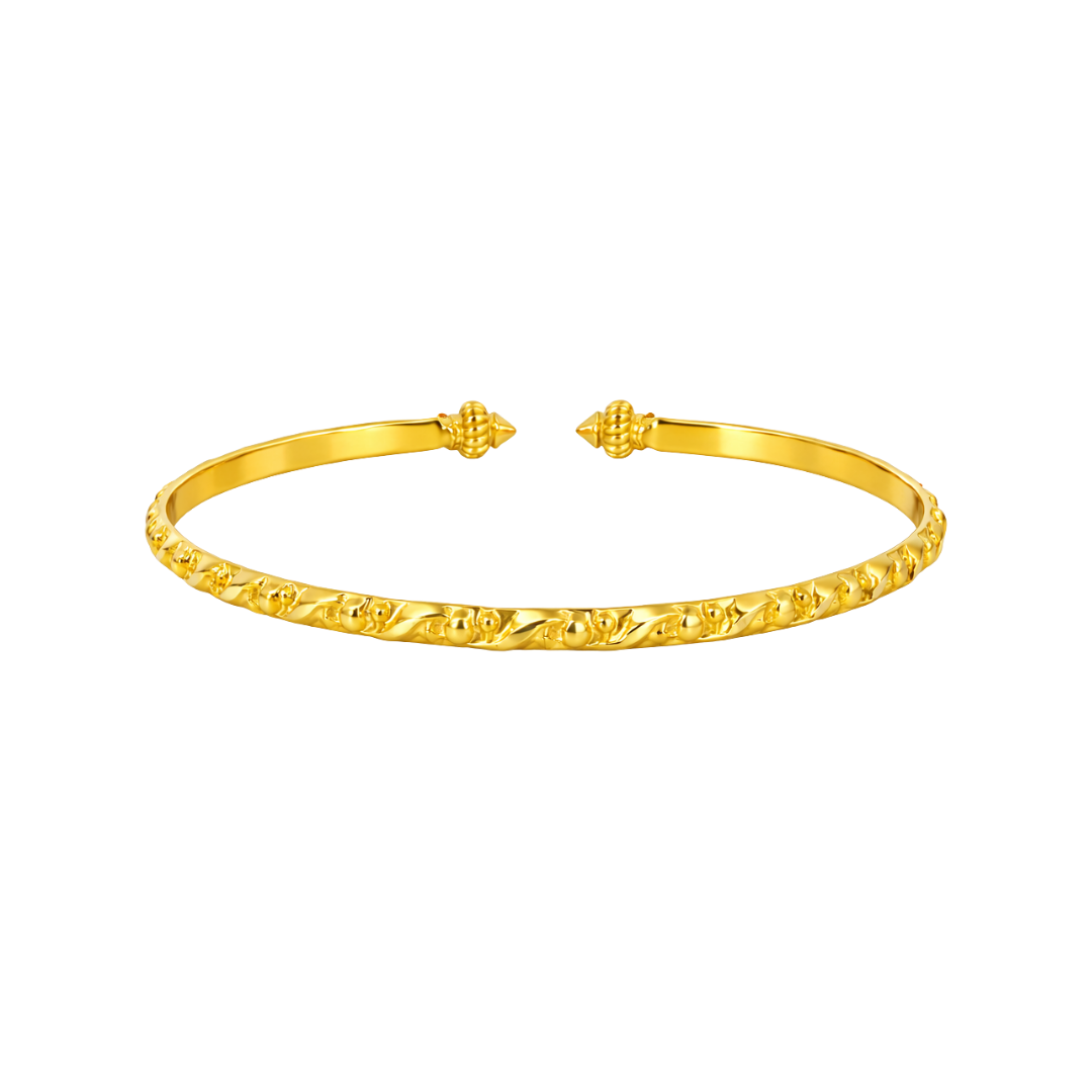 Each element is finished with a rich high-polish yellow gold shine, allowing light to flow smoothly across the bracelet while emphasizing the dimensional texture of the raised design. The open bangle structure is balanced for both durability and comfort, making it suitable for everyday wear while maintaining its refined appearance.