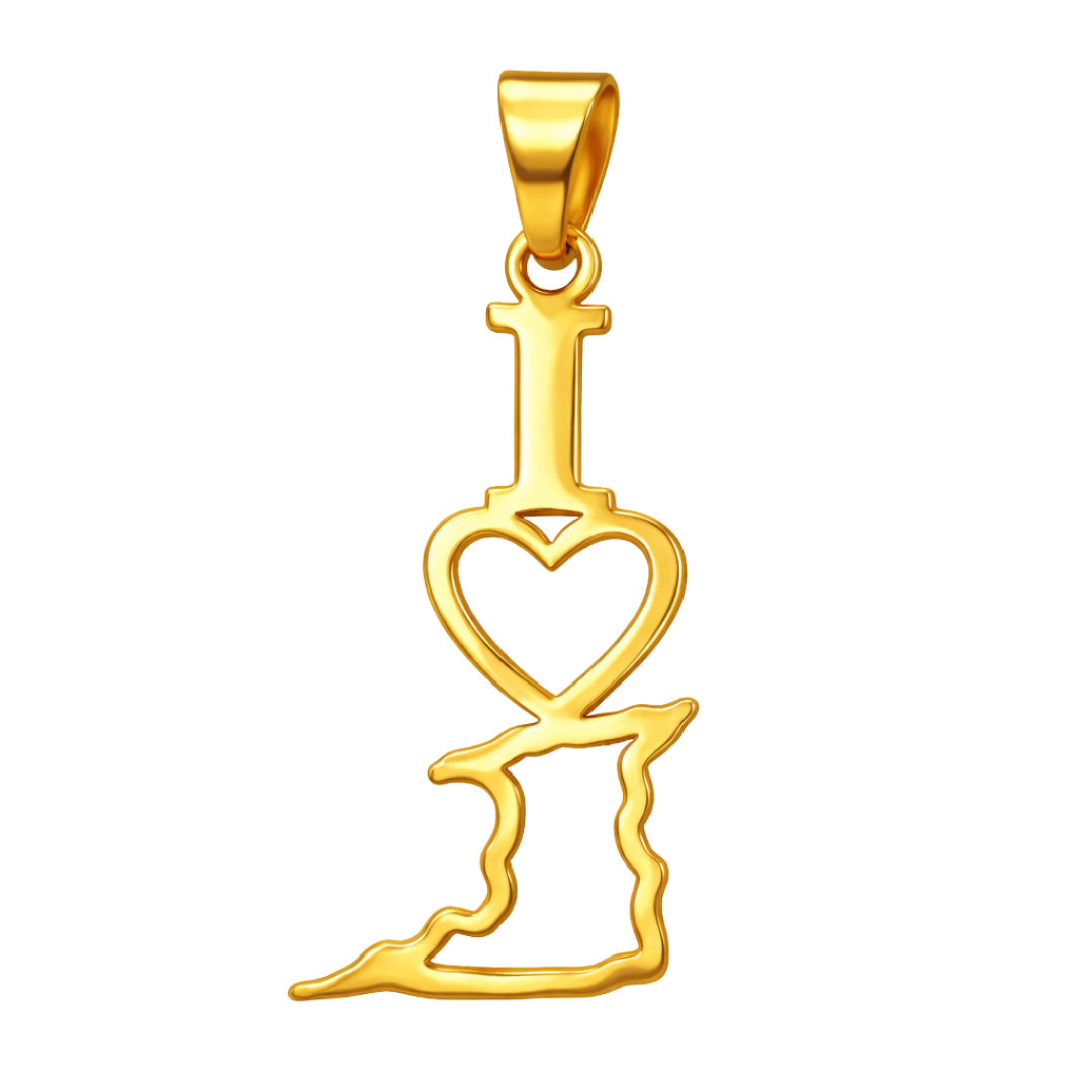 This pendant features a graceful “I ♥ Trinidad” silhouette, combining clean lines with an open, airy design. The heart element represents deep connection and affection, while the fluid outline of Trinidad grounds the piece in unmistakable island identity. Its minimalist open-form structure keeps the pendant lightweight while allowing the polished gold contours to stand out with clarity and elegance.