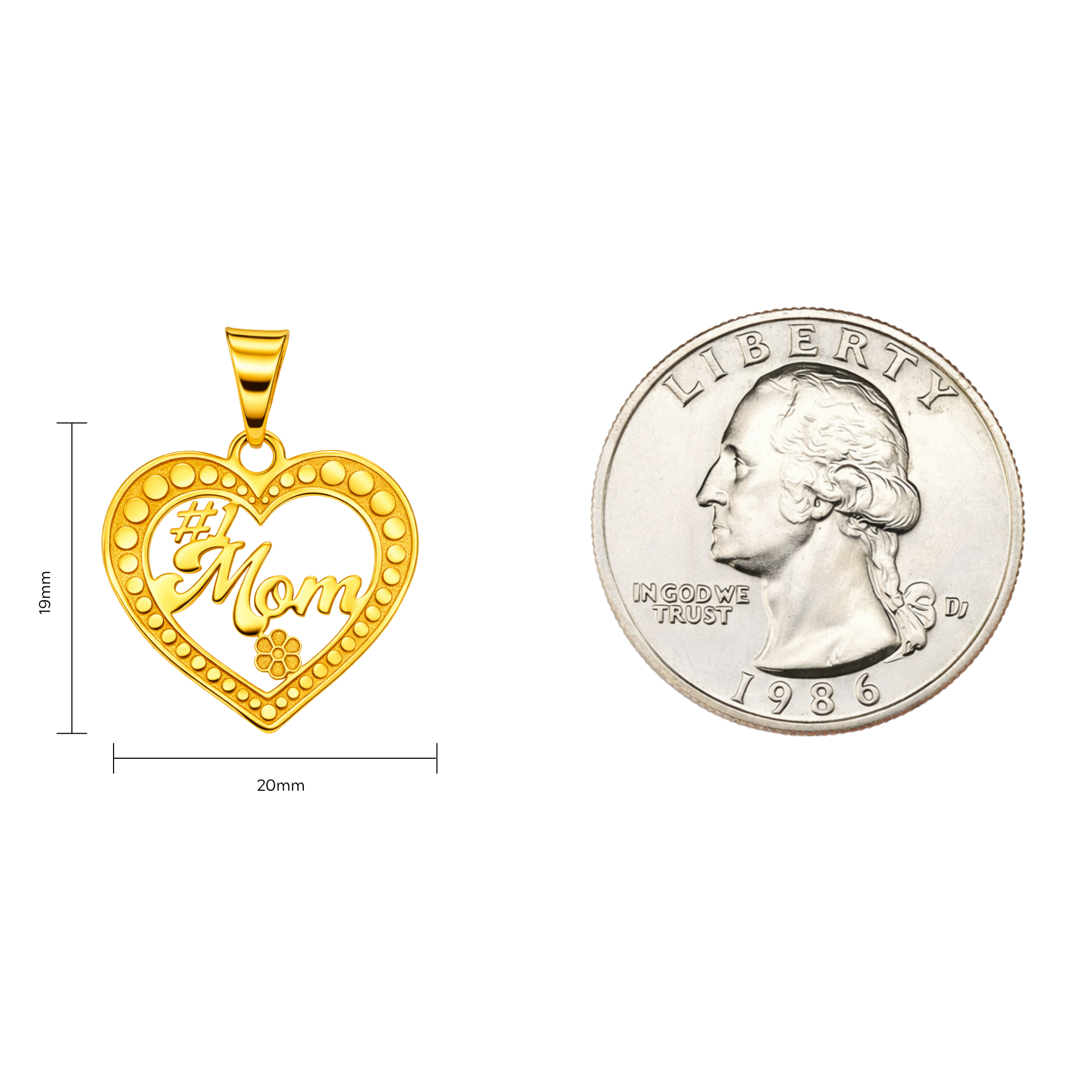 - Design: Open heart with “Mom” script, dotted border, and floral detail