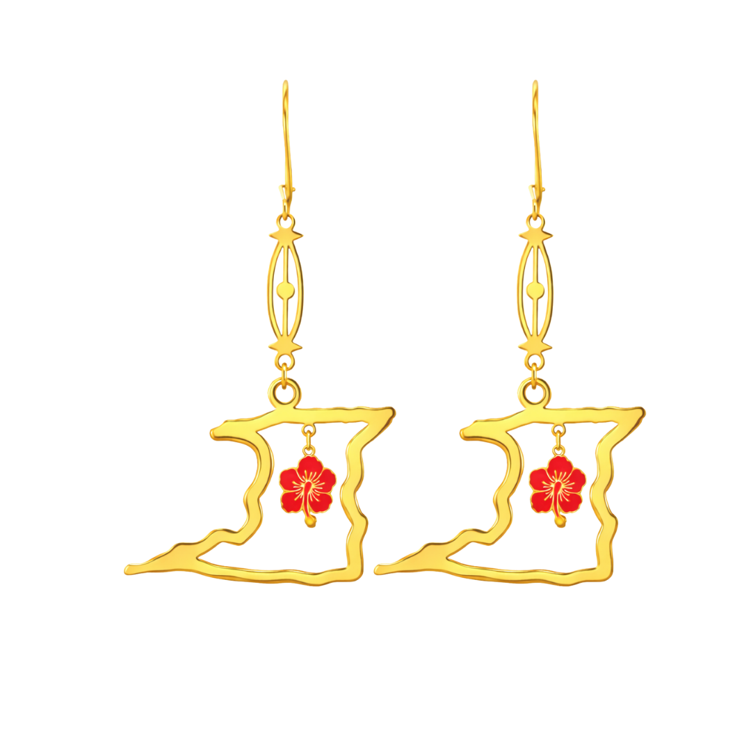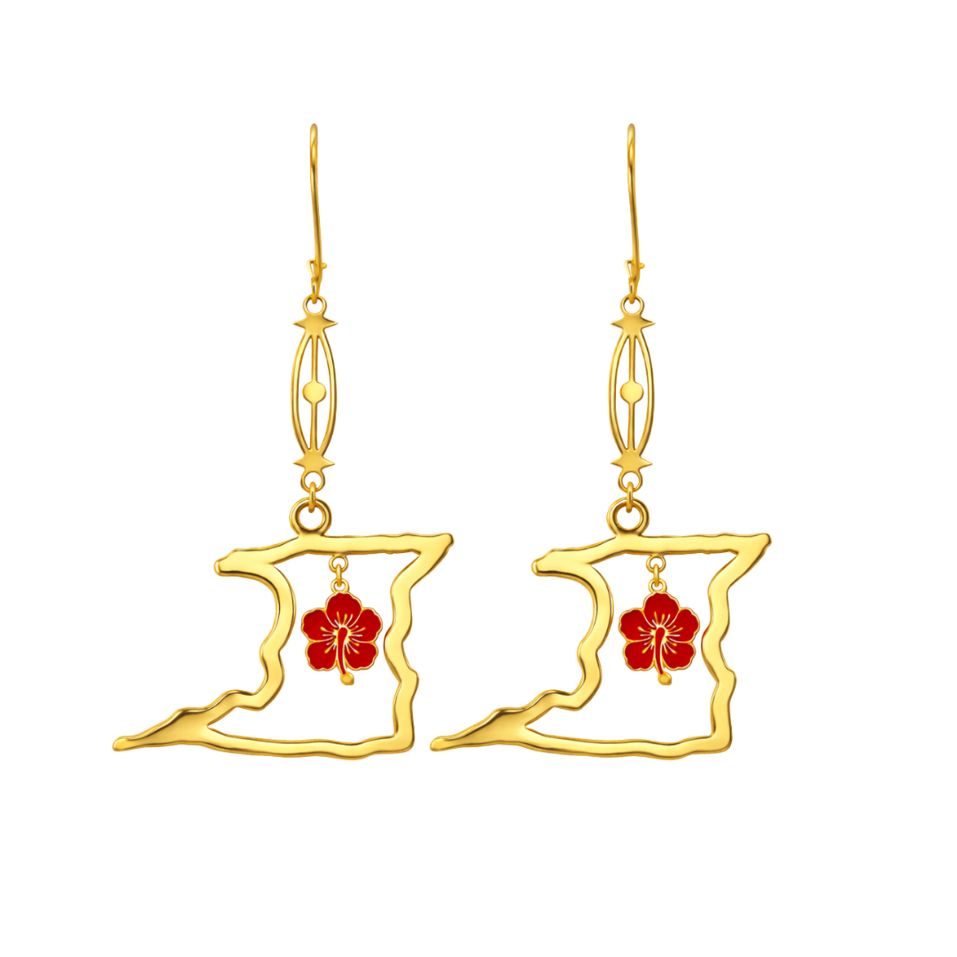 These long hanging earrings feature an open 2D outline of Trinidad, highlighting the island’s natural contours in a clean, airy form. At the center, a red enamel hibiscus charm is delicately suspended, adding a soft pop of color and symbolic beauty. The elongated drop and slender connector allow for gentle movement, creating an elegant sway that enhances the overall design while keeping it balanced and wearable.