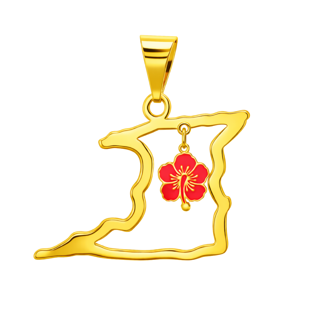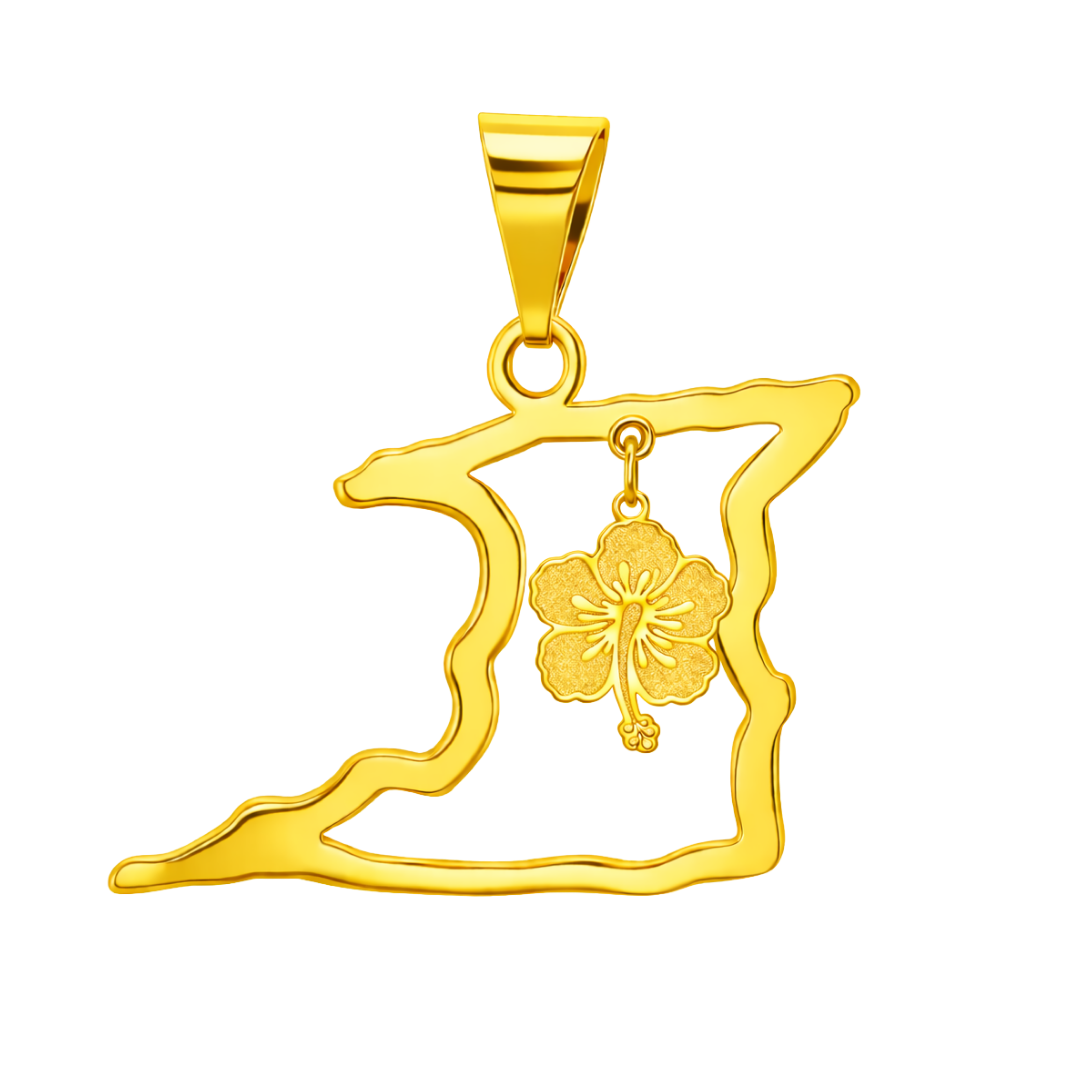 This pendant features an open 2D outline of Trinidad, capturing the island’s natural contours in a light, airy silhouette. Suspended within is a red enamel hibiscus charm, adding gentle movement and a striking pop of color. The contrast between the polished gold outline and the vivid floral charm creates a balanced design that feels modern, meaningful, and deeply rooted in Caribbean heritage.